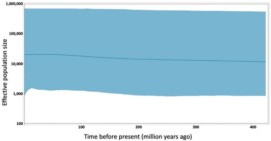 - Rambaut, A.; Drummond, A.J.; Xie, D.; Baele, G.; Suchard, M.A. Posterior summarization in Bayesian phylogenetics using Tracer 1.7. Syst. Biol. 2018, 67, 901. [Google Scholar] [CrossRef]