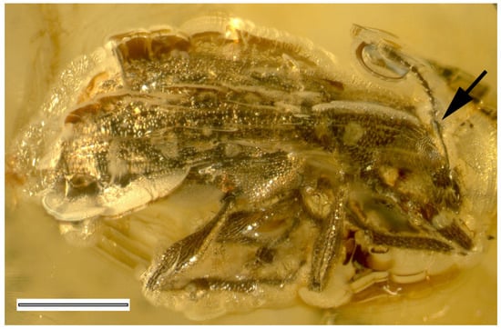 Paonaupactus katyae, holotype. Scale bar = 1.0 mm. Arrow shows apex of antennal scape.
