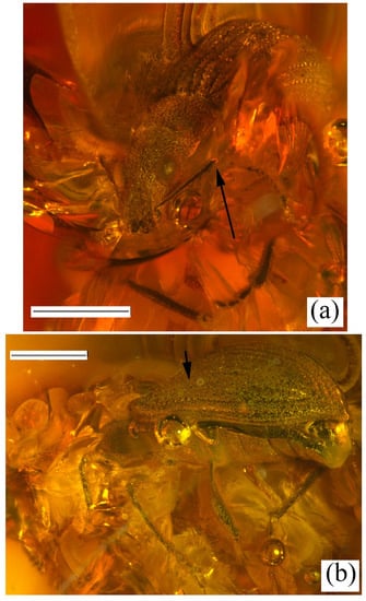 - Perkovsky, E.E.; Odnosum, V.K.; Nazarenko, V.Y.; Vasilenko, D.V. First record of the genus Cyrtanaspis Emery (Insecta: Coleoptera: Scraptiidae) from Baltic amber. Paleontol. J. 2022, 56, 208–212. [Google Scholar] [CrossRef]