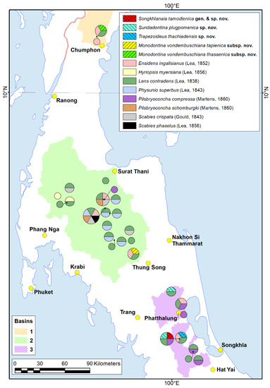 Distribution ranges of Unionidae from Southern Thailand, including the new taxa. The new taxa are marked by corresponding shading and color. The river basins are highlighted in color: 1—Tha Taphao River basin; 2—Tapi River basin; 3—Songkhla Lake basin. The map was created using ESRI ArcGIS 10 software (www.esri.com/arcgis, accessed on 19 October 2022).