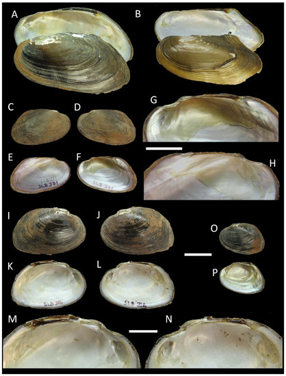 - Konopleva, E.S.; Pfeiffer, J.M.; Vikhrev, I.V.; Kondakov, A.V.; Gofarov, M.Y.; Aksenova, O.V.; Lunn, Z.; Chan, N.; Bolotov, I.N. A new genus and two new species of freshwater mussels (Unionidae) from western Indochina. Sci. Rep. 2019, 9, 4106. [Google Scholar] [CrossRef]