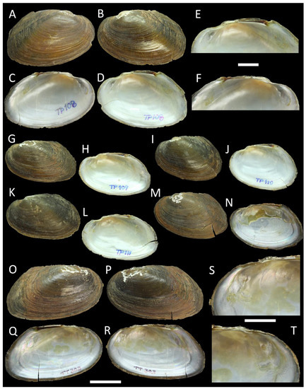 Shells of Monodontina from Southern Thailand. (A–F) Monodontina vondembuschiana tapienica ssp. nov., holotype RMBH biv 1272/1, Main Klong Min, Nakhon Si Thammarat Province: right (A) and left (B) valve view, inside view of left (C) and right (D) valve, interior view zoom fragment of right (E) and left (F) valve; (G,H) M. v. tapienica ssp. nov., paratype RMBH biv 1272/2, the same locality: (G) left valve view, (H) inside view of right valve; (I,J) M. v. tapienica ssp. nov., paratype RMBH biv 1272/3, the same locality: (I) left valve view, (J) inside view of right valve; (K,L) M. v. tapienica ssp. nov., paratype RMBH biv 1272/4, the same locality: (K) left valve view, (L) inside view of right valve; (M,N) M. v. thasaenica ssp. nov., paratype RMBH biv 1321/2, Main Klong Thasae, Chumphon Province: (M) left valve view, (N) inside view of right valve; (O–T) M. v. thasaenica ssp. nov., holotype RMBH biv 1321/1, the same locality: right (O) and left (P) valve view, inside view of left (Q) and right (R) valve, anterior fragment of right (S) and left (T) valve. Scale bar = 20 mm (A–D,G–R); scale bar = 10 mm (E,F,S,T). Photos: Ekaterina S. Konopleva.