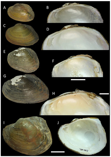 - Lopes-Lima, M.; Froufe, E.; Ghamizi, M.; Mock, K.E.; Kebapçı, Ü.; Klishko, O.; Kovitvadhi, S.; Kovitvadhi, U.; Paulo, O.S.; Pfeiffer, J.M.; et al. Phylogeny of the most species-rich freshwater bivalve family (Bivalvia: Unionida: Unionidae): Defining modern subfamilies and tribes. Mol. Phylogenet. Evol. 2017, 10, 174–191. [Google Scholar] [CrossRef]