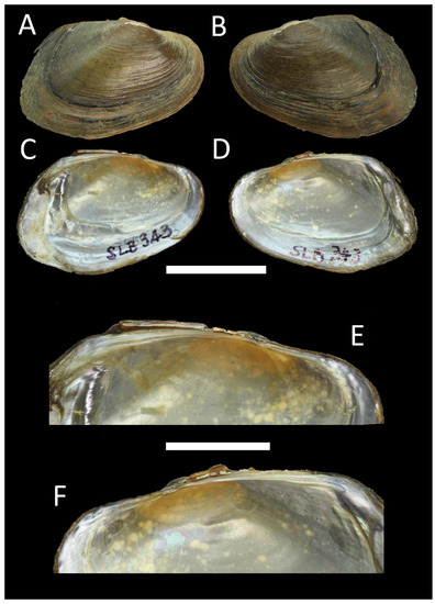 - Pfeiffer, J.M.; Graf, D.L. Evolution of bilaterally asymmetrical larvae in freshwater mussels (Bivalvia: Unionoida: Unionidae). Zool. J. Linn. Soc. 2015, 175, 307–318. [Google Scholar] [CrossRef]