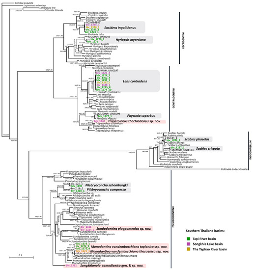 Output parameters of the bPTP model under the highest Bayesian solution for the Pseudodontini clade were as follows: estimated number of species = 29–60; mean value = 40.51; acceptance rate = 0.40. For the Trapezoideus clade, these values were as follows: estimated number of species = 5–36; mean value = 20.92; acceptance rate = 0.71. According to the highest Bayesian supported solution, one representative of Trapezoideus, Sundadontina, and a new Pseudodontini genus from Southern Thailand were recognized as distinct species (Dataset S1). In the mPTP analyses, only specimens of Trapezoideus and a new Pseudodontini genus were distinguished as separate species. Available Trapezoideus specimens were joined with T. subviridus Pfeiffer et al., 2021 [4], to form a single molecular operational taxonomic unit (MOTU) in the ASAP analysis. Monodontina representatives were not supported as separate taxa and were combined into one species with M. vondembuschiana (Lea, 1840), M. laosica Bolotov et al., 2020, and M. mekongi Bolotov et al., 2020 in all delimitation analyses (Dataset S1).