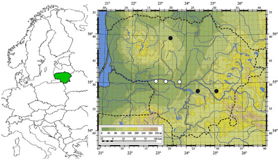 A distribution map of subsp. australis in Lithuania was compiled, applying a system of grid cells that were arranged according to the geographical coordinates with sides of 6’ of latitude and 10’ of longitude [56]. Sites recorded in the same grid cell were marked on the map with a single dot.