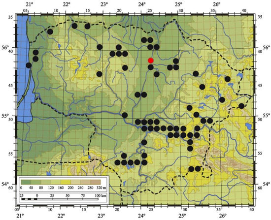 The current distribution of Cornus sanguinea subsp. australis in Lithuania. The red dot marks the first record of this taxon in Lithuania; the black dots mark localities based on the results of this research.