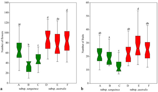 Comparison of the number of flowers (a) and the number of fruits (b) at the study sites of Cornus sanguinea subsp. sanguinea (A—Piepaliai; B—Veliuona; C—Šilinė) and Cornus sanguinea subsp. australis (D—Maišiagala; E—Ginkūnai; F—Kaišiadorys). Different lower-case letters denote statistically significant differences between the means among the sites, applying the Mann–Whitney U-test.
