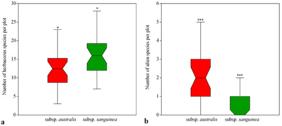 Comparison of the number of herb species (a) and the number of alien species (b) between study plots with Cornus sanguinea subsp. australis and Cornus sanguinea subsp. sanguinea. Asterisks above the whiskers indicate the differences between all study plots according to the results of the two-sample Mann–Whitney test (*—p < 0.05; ***—p < 0.001).