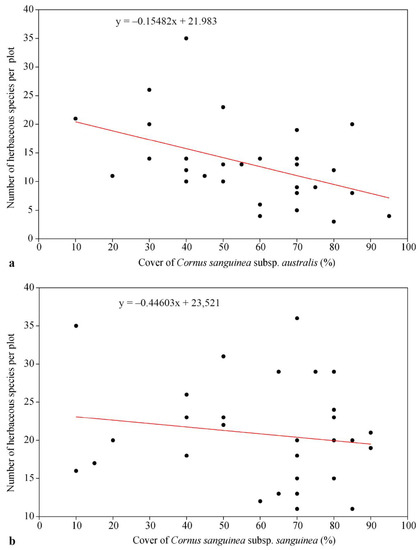 Relationship between the coverage of Cornus sanguinea subsp. australis (a) and Cornus sanguinea subsp. sanguinea (b) and the number of herbaceous plant species per plot.