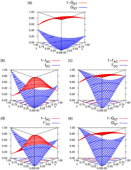 Figure 2 also illustrates certain characteristics that are common to all mixtures, regardless of their marginal distributions and assignment mappings. At the corner , where (full neutrality), the type variation within communities equals 1 when measured as apportionment (here ), and type variation among communities equals 0 when measured as differentiation (here ). If y is held constant, variation within communities decreases as x increases, and it reaches 0 for if CC is fully realized. For constant x, variation among communities increases as y increases, and it reaches 1 for if CD is fully realized.