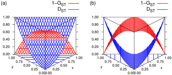 The basis for graphical representation is formed by the coordinates x and y that specify each mixture q of the components for CC, CD, and neutrality for given marginal distributions and assignment mappings and . Geometrically, the space of all such mixtures can be pictured as a triangle in two-dimensional real space. The triangle is spanned by the interval on the x axis and the interval on the y axis, and the line connecting the coordinates and along which equals 1. For all points on the edges and in the interior of the triangle, holds. By identifying the coordinates of the triangle with the coefficients of the joint distribution , every mixture of the tendencies has its unique position on the triangle. By plotting the indices of apportionment and differentiation as three-dimensional surfaces over the triangle, the dependence of the indices on the tendencies can be visualized.