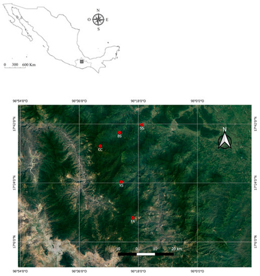 Sierra de Juárez is located in the north of the state of Oaxaca, in the district of Ixtlán de Juárez, delimited by the geographic coordinates 17°46′ N, 96°30′ W and 17°02′ N, 96°16′ W (Figure 1). Temperate climate predominates in the region, although there is a vast mosaic of climates on a local scale, ranging from semi-warm humid and sub-humid to semi-cold and temperate humid in the highest parts [28]. These are associated with a gradient of temperature and particular vegetation types, where pine forests predominate, followed by high evergreen tropical forests and mountain cloud forests, among others [29]. The mean annual temperature ranges between 12 °C and 18 °C, but it may drop to less than 12 °C at higher altitudes, and frost events may occur. Precipitation varies from 800 mm to 1200 mm per year, with a summer rainfall pattern. The five collection sites correspond to different streams distributed along an altitudinal gradient [22,23] ranging from 136 m a.s.l. (Soyolapam stream) to 2432 m a.s.l. (Cascadas de Comaltepec) (Table 1). These streams are located within the Papaloapan River hydrological basin (RH28) and in the subbasins of the Valle Nacional River [Soyolapam stream (SS), Bobo stream (BS), Cascadas de Comaltepec (CC)] and the Playa Vicente River [Yegu-Iag-Lagu stream (YS), Flor de Azahar stream (FA)] [30].