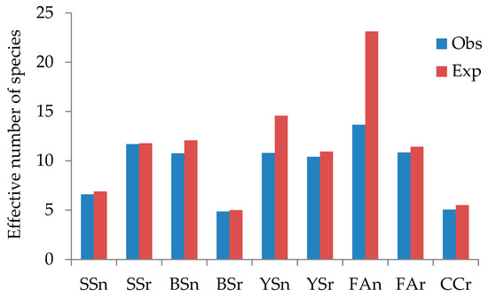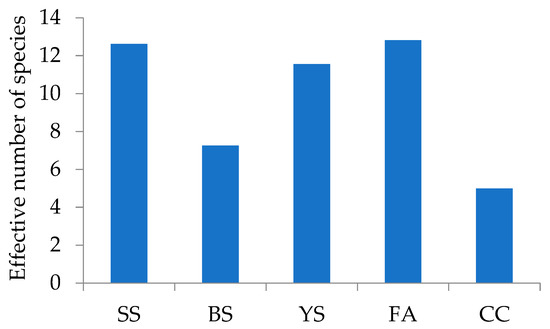 In contrast to the number of species, true alpha diversity per site was 2.57-fold higher at FA (12.82 effective species) than at CC, where the lowest diversity was recorded (4.99 effective species, Figure 4).