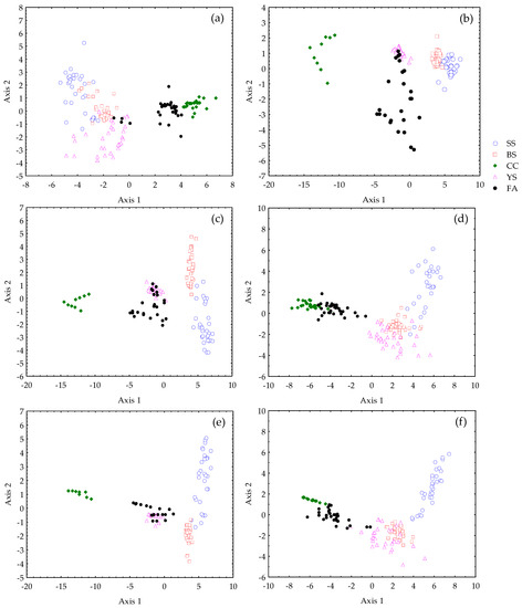 Discriminant analysis based on the abundance of different taxa and different seasons in relation to the temperature and relative humidity in the Sierra de Juárez, Oaxaca, Mexico. Axes 1 and 2. (a) families “nortes”, (b) families rains, (c) genera “nortes”, (d) genera rains, (e) species “nortes”, (f) species rains.