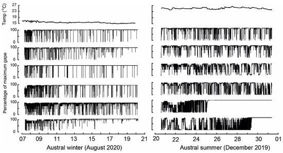 3.3. Water Temperature and Valve Gape Activity
