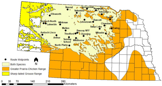 Since 1956, the NGPC has monitored prairie grouse abundance using annual count surveys on the spring breeding grounds (Figure 1). Between April 1 and 9 on clear mornings with little to no wind, observers drive 20-mile survey routes following unimproved roads, listening for the vocalizations of male prairie grouse displaying on leks (prairie-chickens) or booming grounds (sharptails). The observers stop at 1-mile (~1.6 km) intervals, listen for mating calls during a 5-min period, and mark auditory detections on a map [40]. Surveys begin 1 h before sunrise and finishing no later than one-half hour after sunrise.