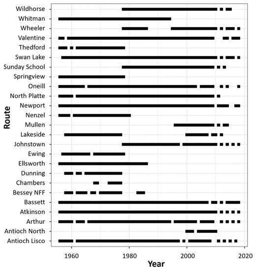 Available years of spring breeding ground count data from 1956 to 2018 for each of the 25 historical transects located in the Sandhills of Nebraska, USA. The black rectangles represent the collection of count data for a route in a given year. White spaces indicate an absence of data.