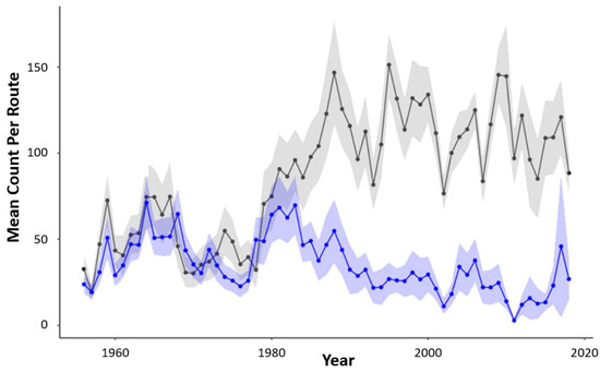 Mean number of male sharptails (blue line) and prairie-chickens (grey line) per breeding ground survey route from 1956 to 2018 in the Sandhills of Nebraska, USA. Trend lines are shown with 95% confidence intervals.