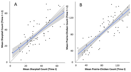 Scatter plots of (A) sharptail and (B) prairie-chicken mean breeding ground counts from consecutive years between 1956 and 2018 in the Sandhills of Nebraska, USA. The dashed lines represent a 1:1 relationship (counts from consecutive years have identical values). Trend lines are linear models with 95% confidence intervals.