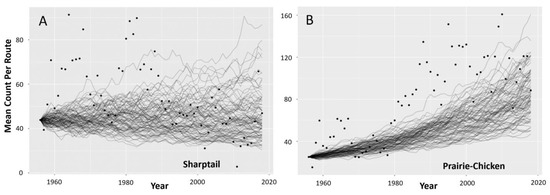 The interpretation of the prairie grouse population trends in Section 4.1 assumes that the observed patterns describe biological processes shaping species abundance and distribution. However, SBGC trends may be biased by the observation protocol and method of data aggregation [48]. Before making conservation recommendations for prairie grouse based on the longitudinal SBGC data, it is best practice to ensure that population trends represent biological processes, rather than artifacts of the sampling protocol or analyses [49].