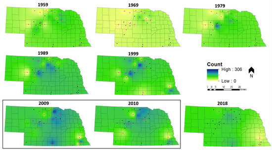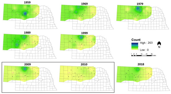 Sharptail inverse distance weighted spatial population trends at decadal intervals from 1959 to 2018 in the Sandhills of Nebraska, USA. Pink route midpoints indicate that data were collected at that location in a given year. The two adjacent years encompassed within the black box were included to illustrate the effect of changing the subset of monitored routes between years when little change in population distribution has likely occurred. The time series ends in 2018 with the last year of available data.