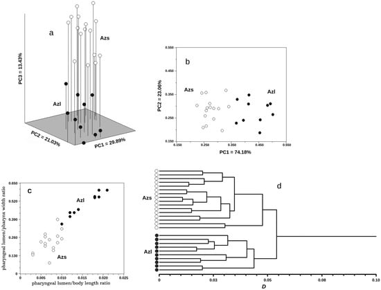 Results of the multidimensional analysis. The distribution of the individuals in the first three principal components space according to: of studied characters (a) three principal components space of 23 characters; (b) two principal components space of 3 characters; (c) space of 2 characters; (d) Dendrogram of cluster similarity. Abbreviations: D—Manhattan distance; Azl—Azygia lucii; Azs—Azygia sibirica n. sp.