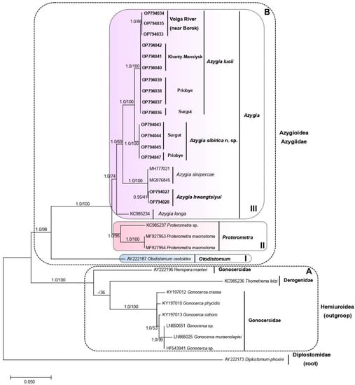 The consensus phylogenetic tree (BI/ML), reconstructed for eight azygiid species (analyzed group) and six hemiuroid species (outgroup), based on the 28S rRNA gene fragment. The values of the bootstrap support are indicated on the branches. The tree was rooted with Diplostomum phoxini. Symbols on the figure: A, B—clades; I, II, III—subclades.