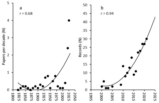 (a) Trends in the number of published scientific papers mentioning Astrospartus mediterraneus per decade from 1800 to the present and (b) of the number of records obtained from the citizen science databases divided per year from 2000 to the present.