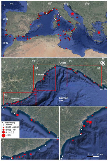 (a) Distribution of Astrospartus mediterraneus in the Mediterranean Sea and Atlantic waters. Red circles, scientific papers; white spots, citizen science observations; red stars, presence without indication of geographic coordinates. (b) Map of the Ligurian Sea with indicated the studied sites in the three macro-areas (A1, Eastern Liguria; A2, Central Liguria; A3, Western Liguria). (c–e) Enlargements of the three macro-areas. Red circles are sites with A. mediterraneus (the size of the circle is proportional to the density of the specimens); white circles are sites without recorded specimens.