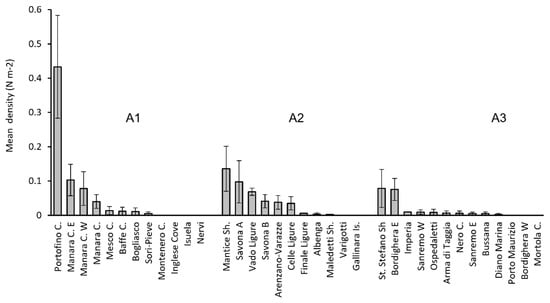Sites in the three explored macro-areas (A1, Eastern Liguria; A2, Central Liguria; A3, Western Liguria) were sorted according to decreasing order of recorded mean density (±SE).