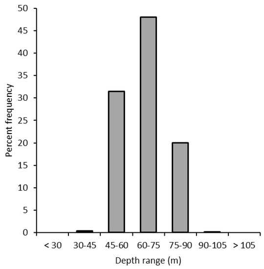 Regarding the depth range, the species was observed between 42 and 101 m, with a peak between 60 and 75 m (Figure 4). All the individuals were found on gorgonians (Eunicella cavolini (Koch, 1887), E. verrucosa (Pallas, 1766), Paramuricea clavata (Risso, 1827), and Leptogorgia sarmentosa (Esper, 1791)) (Figure 5a–d) and on massive sponges (Aplysina cavernicola (Vacelet, 1959), Sarcotragus foetidus Schmidt, 1862, Spongia lamella (Schultze, 1879), and Axinella polypoides Schmidt, 1862) (Figure 5e).