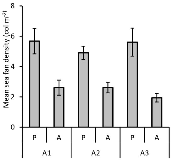 Mean density (±SE) of the gorgonian forests in sites with the presence (P) and absence (A) of Astrospartus mediterraneus in the three studied macro-areas.