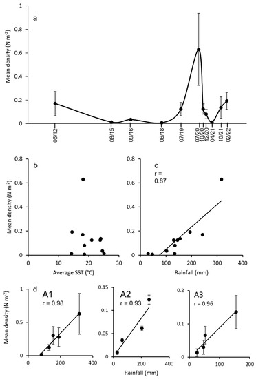 At the regional scale, the temporal trend of the mean densities was variable, with a main peak in July 2020 (Figure 7a). While data did not show any significant correlation with a mean SST (Figure 7b), a strong relationship (r = 0.87) was evident with the amount of rainfall in the three months before each survey (Figure 7c). The correlation with rainfall was more robust in the summer months (r = 0.96) than in winter ones (r = 0.81). The correlation between rainfall and basket star density during summer months was also very strong when considering the three macro-areas separately (Figure 7d(A1–A3)).