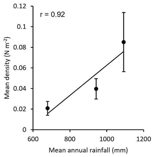 Correlation of the A. mediterraneus mean density (±SE) in the three considered macro-areas vs. the mean annual rainfall in the area.