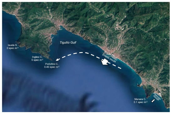 Along the Ligurian coast, the amount of rainfall is a good driver at a geographic level in solving the different abundances of A. mediterraneus in the three considered macro-areas. In fact, the mean density of specimens progressively decreases from East to West, and this trend is completely in agreement with that of the mean annual amount of rainfall. The influence of rainfall reaching the sea through the rivers’ mouth is clarified considering, for example, the situation of the Tigullio Gulf, in the center of the Ligurian Arc, the area with the higher amount of recorded basket stars. The presence of A. mediterraneus at Manara Cape is related to the input of the close Petronio River (mean flow rate 1.24 m3 s−1). The high basket star density recorded on the Portofino Cape is driven by the Entella River (mean flow rate, 15.88 m3 s−1), the plumes of which reach this area thanks to the surface current of the Gulf [51,52]. It is remarkable that in other sites present on the Promontory (Inglesi Cove and Isuela Shoal) that are sheltered by Portofino Cape, the species was never found (Figure 9).