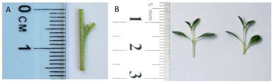 Propagation of initial explants from plant collections: (A) a uninodal segment used for the in vitro establishment of A. taltalensis; (B) Initial explants with shoots used for multiplication.