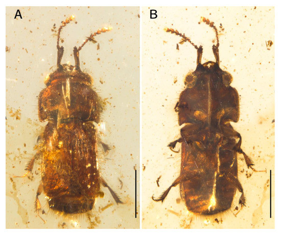 Photomicrographs of Scaporetes rectus gen. et sp. nov. from mid-Cretaceous Burmese amber under normal reflected light (holotype, NIGP200944): (A) dorsal view; (B) ventral view. Scale bars: 0.5 mm.