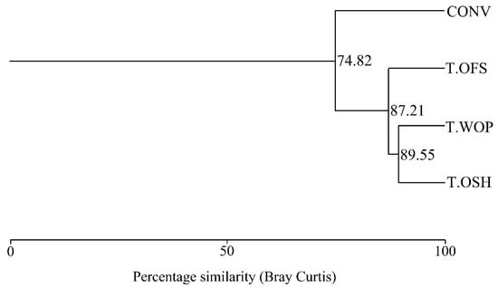 Diagram of the cluster analysis (Bray–Curtis index) indicating the similarities between the four coffee (Coffea arabica) production systems, namely, conventional (CONV) and transition to organic shaded (T.OSH), organic full-sun (T.OFS), and without pesticide (T.WOP). February 2013 to December 2014. Campo do Meio and Guapé, MG, Brazil.