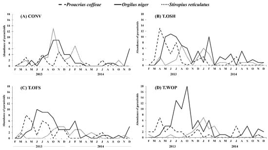 In the T.OSH areas, there was a greater abundance of O. niger in June and July 2013 and most months of 2014. The parasitoid P. coffeae was most abundant in April 2013, with population peaks in April and June 2013 and January and July 2014, and the same was true of S. reticulatus in August 2013 and January 2014 (Figure 2B).