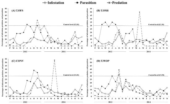 In T.OFS (Figure 3A), the highest infestation rates were observed in October 2013 and October 2014, reaching values of 13% and 14%, respectively. The highest predation rates (38% and 30%) were observed in November 2013 and January 2014. The highest parasitism rates (32% and 30%) were observed in July 2013 and November 2013.