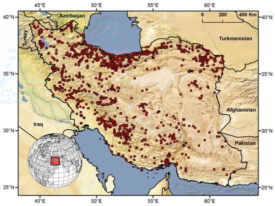 More than 300 publications were examined, most of which are available from the World Spider Catalog [1]. The coordinates were taken from the original publications or georeferenced a posteriori using online sources (e.g., Google Earth) if no coordinates were provided. The coordinates were checked and clipped based on the Iranian shapefile using ArcMap 10.8 (ESRI, Redlands, CA, USA). Records with coordinates outside of the Iranian borders were removed. A map with occurrence points was produced with a background raster layer with natural cover [43]. All raster files are shown with a stretched symbology with 2.5 standard deviations.