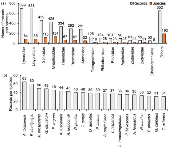 (a) Number of records (grey bars) and species (orange bars) per family, with more than 50 records. (b) Number of records per species with more than 30 records. Other species sum 3611 records. Full species names in alphabetical order: Agyneta fuscipalpa (C. L. Koch, 1836), Archaraeoncus prospiciens (Thorell, 1875), Arctosa leopardus (Sundevall, 1833); Arctosa tbilisiensis Mcheidze, 1946; Aulonia kratochvili Dunin, Buchar & Absolon, 1986; Erigone dentipalpis (Wider, 1834); Gnathonarium dentatum (Wider, 1834); Latrodectus tredecimguttatus (Rossi, 1790); Megalepthyphantes camelus (Tanasevitch, 1990); Oedothorax apicatus (Blackwall, 1850); Pardosa pontica (Thorell, 1875); Pardosa tatarica (Thorell, 1875); Pirata piraticus (Clerck, 1757); Piratula latitans (Blackwall, 1841); Plexippoides flavescens (O. Pickard-Cambridge, 1872); Prinerigone vagans (Audouin, 1826); Steatoda paykulliana (Walckenaer, 1806); Tenuiphantes tenuis (Blackwall, 1852); Tetragnatha extensa (Linnaeus, 1785); and Trochosa hispanica Simon, 1870.