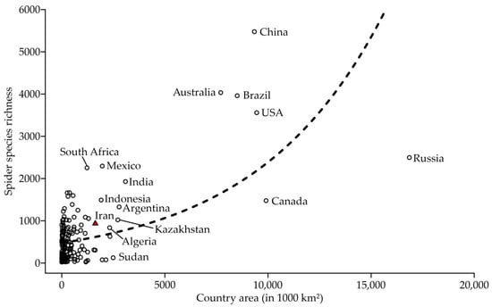 Correlation between area (in 1000 km2) and spider species richness recorded for 171 countries. Raw data is available in Table S2. Iran is highlighted with a red triangle. Some countries with a larger area, highest spider species richness, or highest mean number of species per km2 are labelled in the figure. The dotted line is the regression curve (p < 0.000, F = 82.499, d.f. = 169).