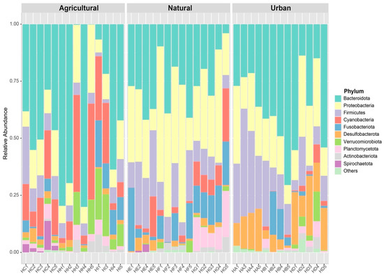 Anthropogenic habitat modification alters the associated terrestrial and aquatic microbial communities and in turn the host microbiome [45,46,72,73]. Our results support these findings as the gut bacterial composition differed for Bufo bufo tadpoles across the three habitat types, with unique microbial profiles characterizing natural, agricultural and urban populations (Figure 1, Figure 2 and Figure S3). Similarly to many species of vertebrates including amphibians, we found that the most abundant phyla of intestinal bacteria were Firmicutes, Proteobacteria and Bacteroidota (amphibians: [39,45,74,75], review of vertebrates: [37]. Bacteroidota and Firmicutes are considered more pathogenic bacteria and are associated with the breakdown of organic matter; an earlier study found that these taxa are more abundant in urban lakes [24]. Similar differences may account for the distinct gut bacterial communities we found here, although we have no data on the aquatic microbial communities inhabiting our study sites. Compared to natural ponds in our study, the ponds in anthropogenic habitats tended to have higher pH, temperature, salinity, conductivity and total dissolved solids, and also had higher concentrations of several chemical pollutants [41,76]. These environmental differences might select for different microbes colonizing the water and thereby the tadpoles’ guts, although the environmental changes may also affect the animals’ physiology and thereby exert selective pressures on the gut microbiome as has been found in fish [9]. Separating the effects mediated by the environmental microbiome versus the host is a worthwhile next step for understanding how differences between habitats emerge.