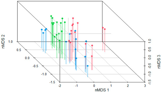 Clustering of tadpoles from natural (green), agricultural (red), and urban (blue) ponds along 3 non-metric multidimensional scaling (nMDS) axes representing the composition of the gut bacterial communities. The two tadpoles in red on the far right stand out because they do not have Bacteroidota, which was the most abundant phylum in the rest of the tadpoles.