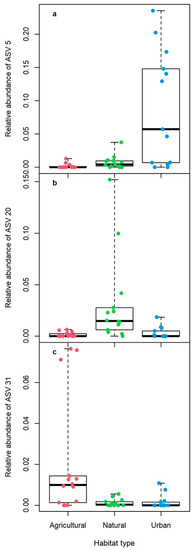 Relative abundance of the three most common ASVs that differed the most across habitat type: (a) ASV 5 from the genus Desulfovibrio (phylum Desulfobacterota, class Desulfovibrionia, order Desulfovibrionales, family Desulfovibrionaceae), (b) ASV 20 from family Sutterellaceae (phylum Proteobacteria, class Gammaproteobacteria, order Burkholderiales), and (c) ASV 31 from Rs-E47 termite group (phylum Bacteroidota, class Bacteroidia, order Bacteroidales). Colored dots represent individual tadpoles from each habitat type (natural: green, agricultural: red, urban: blue); boxplots show the median (thick line), interquartile range (box), and data range (whiskers).