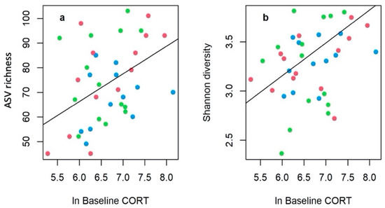 The significantly positive relationships between natural log transformed baseline corticosterone release rates (pg/g/h) and (a) bacterial (ASV) richness and (b) Shannon diversity of the tadpole gut bacterial communities. Regression lines were fitted from GEE models (Table S3) controlling for habitat type (natural: green, agricultural: red, urban: blue).