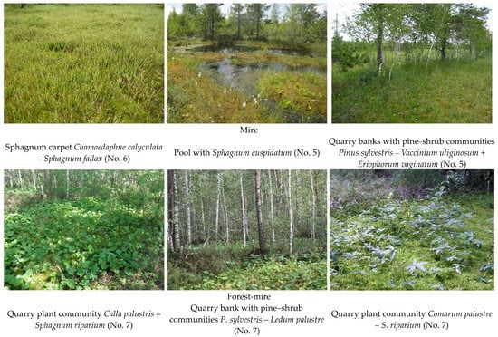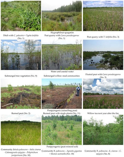The selected plots reflect the characteristic impacts of peat extraction (Table 2) and, at the time of selection in 2005, represented different types of ecological-vegetation complexes representing stages of vegetation regeneration succession [47] with a wide range of plant communities (Figure 3). Swamp complexes were formed in waterlogged peat pits, where sod peat extraction was completed 50–60 years ago, and represent various types of sphagnum communities, occupying more than 50% of the area of the pits. Forest-mire complexes are characteristic of quarries developed more than 80 years ago by hand-cut peat extraction. The centres of the quarries were occupied by swamp grass–sphagnum and grass communities, and the high sides by forest vegetation. Hygrophilous-quagmire complexes are formed in the rewetted areas of milled fields, where groundwater levels (GWL) can fluctuate from +20 above to −40 cm below the surface due to its unevenness. Lakes and coastal-water ecological-vegetation complexes occupy rewetted areas of milling fields. Pools are located in the central part of the fields with coastal-water complexes on the edges of the pools. When the GWL increases, the pools may merge with each other and form a large body of water.