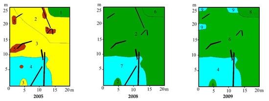 Climatic conditions of the observation years were different. Winter 2006/2007 was relatively warm (tmean −4.9 °C), with mean precipitation (191 mm); spring came early, with low precipitation (94.5 mm); and summer was relatively warm (tmean +18.8 °C), predominantly sunny, with low precipitation (122 mm). The winter of 2007/2008 was warm, with most precipitation in February (104 mm); spring came early with heavy precipitation (225 mm); and summer was warm, with precipitation of 283 mm. The winter of 2008/2009 was warm, with little precipitation (114 mm); spring arrived at an average time during the year, precipitation was 94 mm; and summer was average in rainfall (247 mm). In July–August 2010, due to the extensive anticyclone air temperatures in the European part of Russia, the temperature reached up to record values [57]. The average July temperature was above the long-term average by 4 °C, and August by 4.5 °C, while the maximum temperatures were 36.7 °C in July and 37.7 °C in August. Precipitation was the lowest in the study period, 97.4 mm, representing 45% of the norm. The winter of 2010–2011 was one of the coldest (tmean −10.4 °C) and snowiest, with 171 mm of precipitation compared with 141 mm of the norm. Spring 2011 arrived late and was cool (tmean +5.6 °C), with average precipitation (102 mm). The summer of 2011 was hot and dry, with average temperatures 6.3 °C above normal, and total precipitation was 125.9 mm (58.5% of the norm).